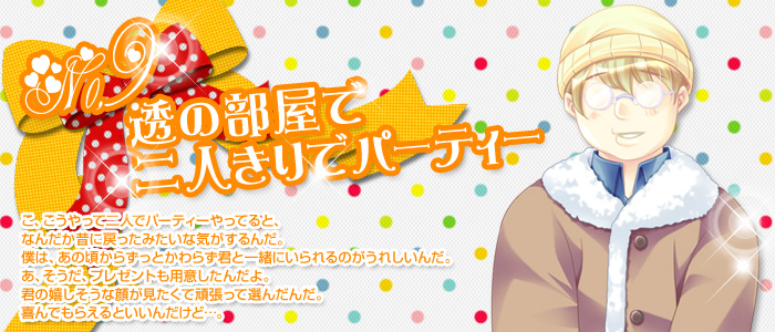 へえ、どこに連れまわされんのかと思ってたら、 意外にインドアな意見が多かったな。 やっぱり好きなヤツとは部屋でふたりっきり、っていうのが人気みたいだな。 まあ、ゆっくり二人の時間を持つっていうのは悪くねえからな。 さて、この研究所も今回がラストだ。1年間のレポート提出、良く頑張ったな。 オレ様もお前等と過ごせて、楽しかったぜ? なんつっても全12回の研究でオレ様の人気がダントツトップだったしな! ……そんな話はいいとか言うなっつの。ったく。 んじゃ、楽しいクリスマスを過ごせよ! あ、正月にモチ食いすぎんなよ! |