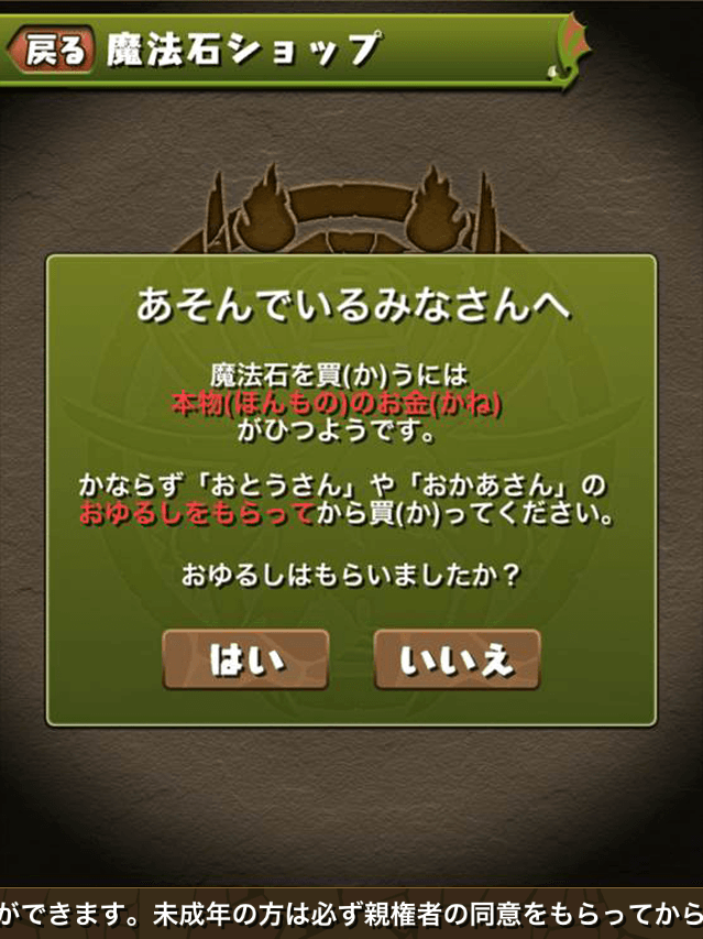 20歳未満の利用者が、保護者の許可なく高額な利用料金の支払いをすることがないよう、当社は手続きの際に、保護者の同意確認画面を表示しています。また、保護者の許可が得られた場合にのみ、料金支払いの手続きができるようにしています。